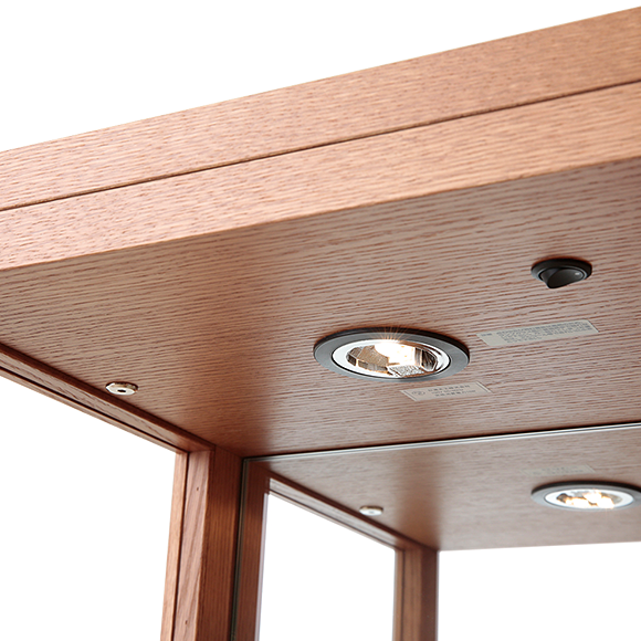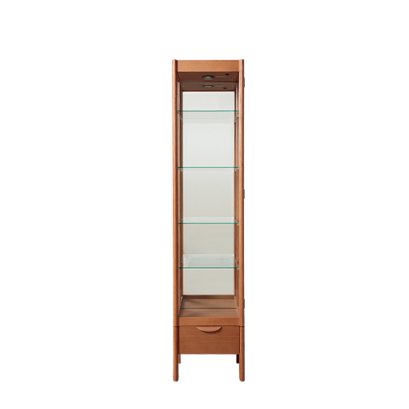 ミラー付のキュリオケース。3面ガラス、引出し・ライト付き。シンプルなので場所を選びません。木部は塗装色を選べます。