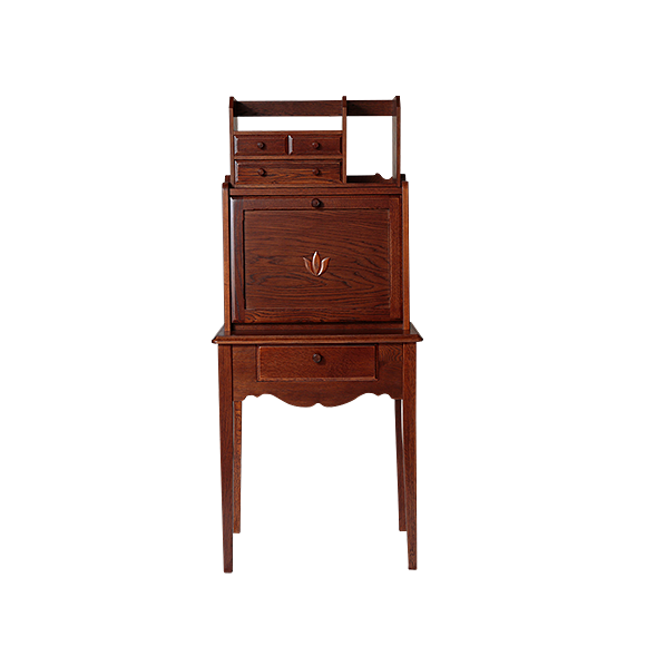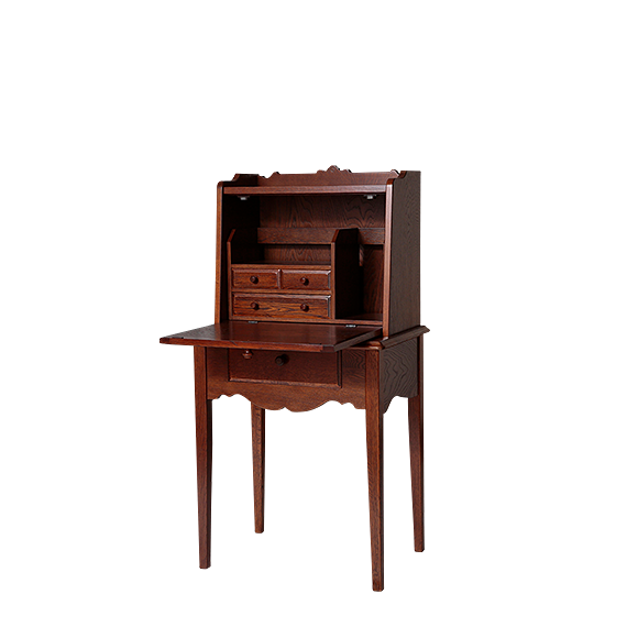 コンパクトなライティングデスクです。木のぬくもりや手間ひまかかる美しい職人の技が光ります。扉の中のブックシェルフは取り出して、上部にのせて使えます。
