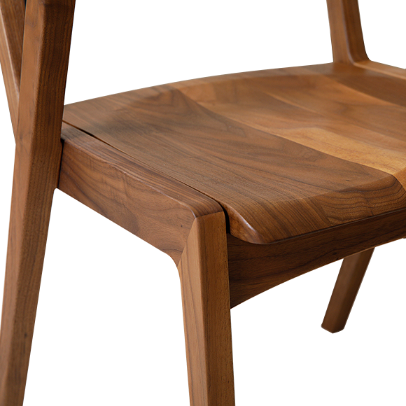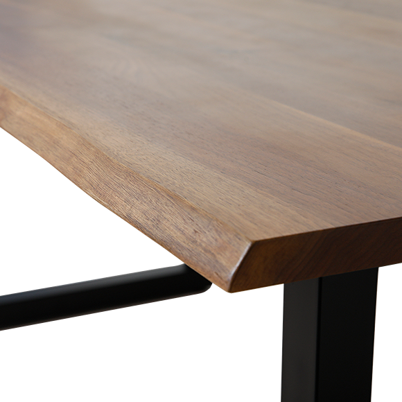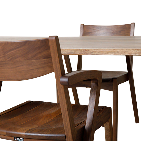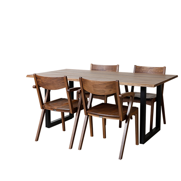 上品さと高級感を兼ね備えた天然の耳付きダイニングテーブル。天然樹皮側の、自然な形状を残しているため、一見一枚板のようにも見えます。一枚板ではないので、サイズオーダーが可能です。スタッキングが可能なダイニングチェアは2017年度グッドデザイン賞受賞!直線と曲線のバランスが絶妙な木の美しさを生かしたデザイン。アームを兼ねるL字型の後ろ脚が特徴でどこから見ても美しい軽快なフォルムもこの後ろ脚がカギとなっています。ダイニングテーブルに合わせて、座高(SH)37~46cmまで1cmピッチで対応が可能です。
