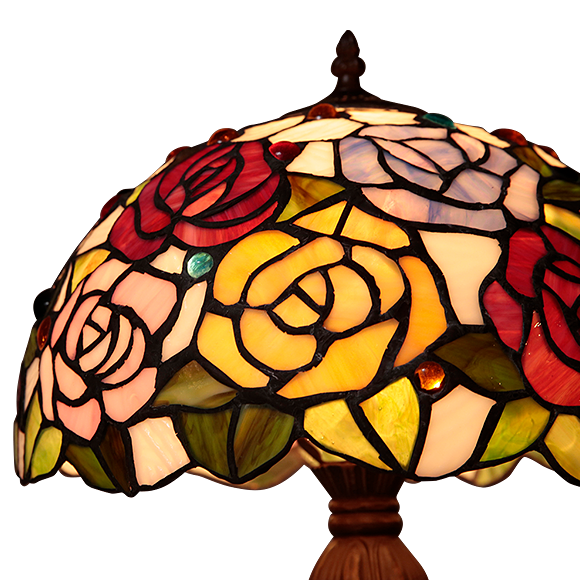 人気の薔薇の花を取り入れたデザインです。背景のガラスが白っぽい色なので明るい雰囲気です。所々にナギットガラスを使っているのでキラキラと光って綺麗です